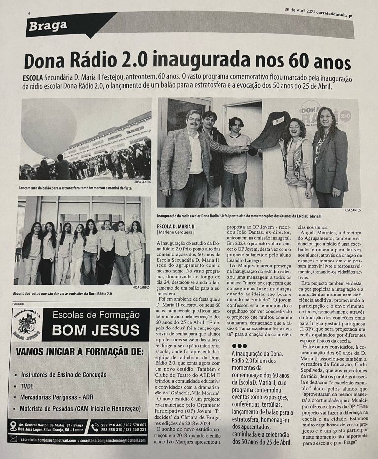 Sobre Nós Dona Rádio 2.0 Inauguração A Dona Rádio 2.0 foi oficialmente inaugurada a 24 de abril de 2024. Foto retirada do Correio do Minho Dona Rádio 2.0 O porquê do nome ser Dona Rádio 2.0 ? Chama-se Dona Rádio pois é uma rádio escolar da Escola Secundária D.Maria II O nome “2.0” reflete o renascimento do projeto Após a existência de uma primeira versão da rádio escolar que deixou de funcionar há alguns anos. Origem do Projeto 2018Ex-aluno Ivo Marques participa Orçamento Participativo Jovens 2023 Ex-aluno Leandro Lamegos participa Orçamento Participativo Jovens Membros da Rádio Conheça a Equipa Bárbara Macedo Aluna Daniela Barroso Aluna Letícia Azevedo Aluna Letícia Teixeira Aluna Saber Mais Em breve chegarão novidades © 2025 Dona Rádio Todos os direitos reservados.